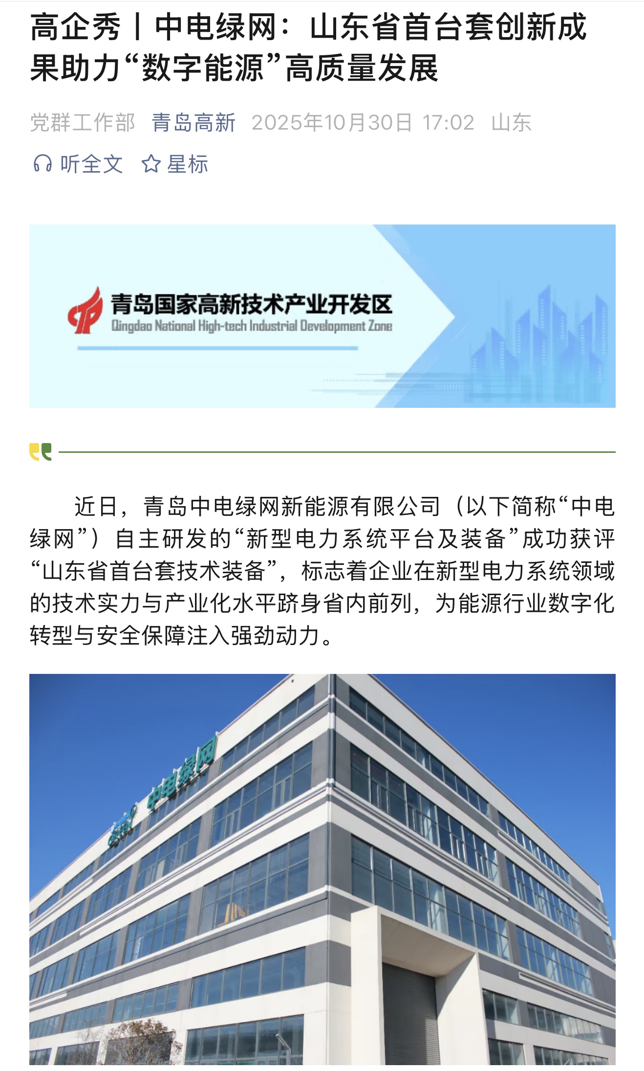 2025年10月30日,青島高新公眾號發(fā)布一篇“中電綠網(wǎng):山東省首臺套創(chuàng)新成果助力“數(shù)字能源”高質(zhì)量發(fā)展”報道,具體內(nèi)容如下: